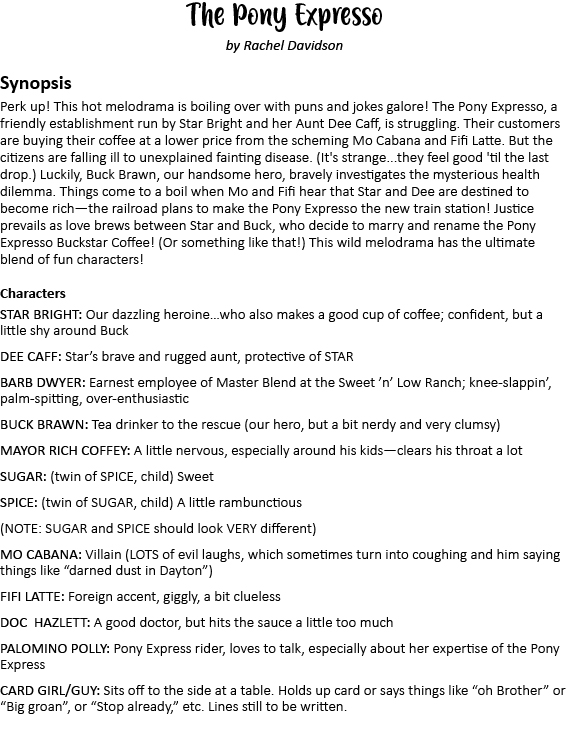Come try out for our Spring play, The Pony Expresso…or The Villain Came to a Grinding Halt! Auditions are Saturday January 24 at 4:00 at the Dayton Library. If you can’t make that date, call Mikie Cline, the director, to schedule another time: 775-434-9571.